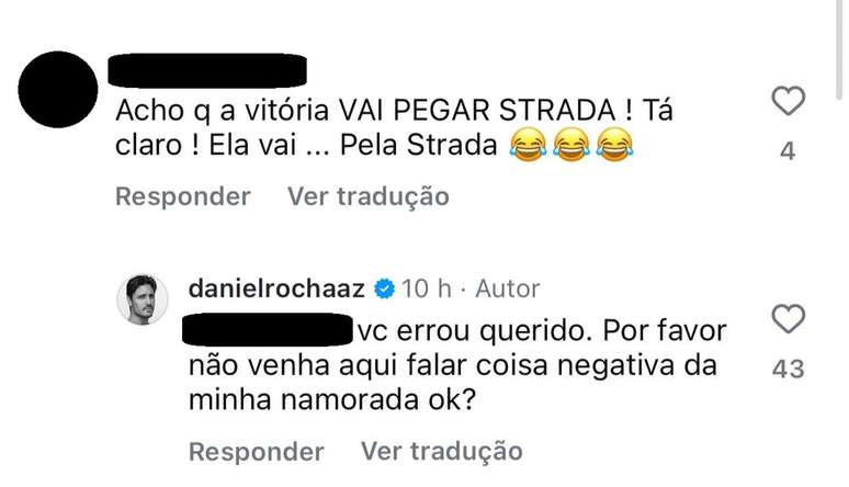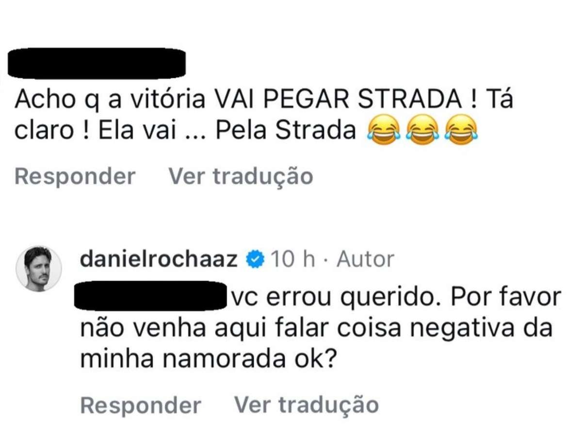"Você errou feio, querido. Por favor, não venha falar coisa negativa da minha namorada, ok?", defendeu o galã. Vale lembrar que Daniel Rocha, de 34 anos, e Vitória Strada, de 28, começaram a namorar em março do ano passado e vinham mantendo o romance longe da mídia.