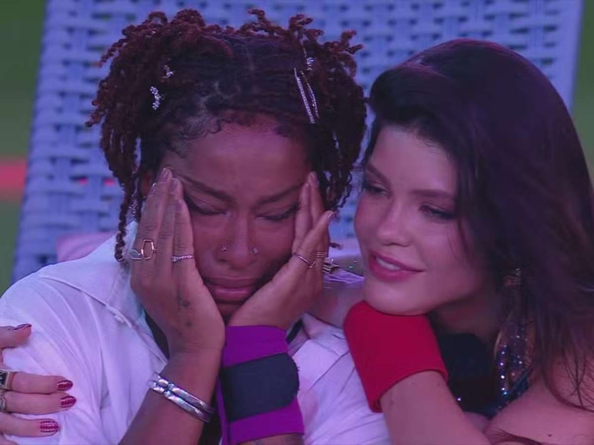 Thamiris chorou muito depois da irmã dela ser anunciada como a eliminada da semana do reality show da TV Globo, sendo auxiliada justamente por Vitória Strada em seu momento de fragilidade por ali.