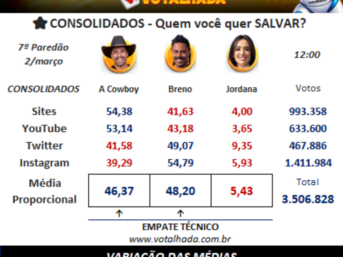 Segundo o Votalhada, a disputa para ter o privilégio do Quarto Secreto é acirrada. A última atualização mostra um empate técnico entre dois participantes. Enquanto Breno surge com 48,20% dos votos para vencer o Paredão Falso, Cowboy está com 46,37%. Já Jordana não tem a menor chance já que conta com apenas 5,43%.