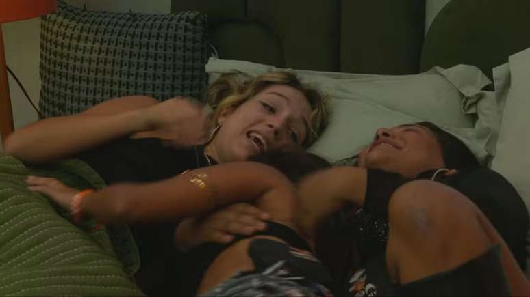 Deitadas durante a festa do líder Jonas Sulzbach no BBB 26, Gabriela, Chaiany e Samira protagonizaram um momento descontraído ao criar uma paródia da música "Anna Júlia", do Los Hermanos, em homenagem ao Veterano. A cena aconteceu na madrugada desta quinta-feira (19) e rapidamente chamou atenção pela mistura de humor, flerte e improviso musical entre as participantes. A atendente de bar iniciou a brincadeira cantando enquanto olhava para a desempregada e adaptando a letra da canção: "Com saúde e Jonas, que não me dá carinho". Logo depois, Chaiany entrou na paródia e complementou apontando para a boca: "E não dá beijo…", arrancando risadas das sisters presentes.