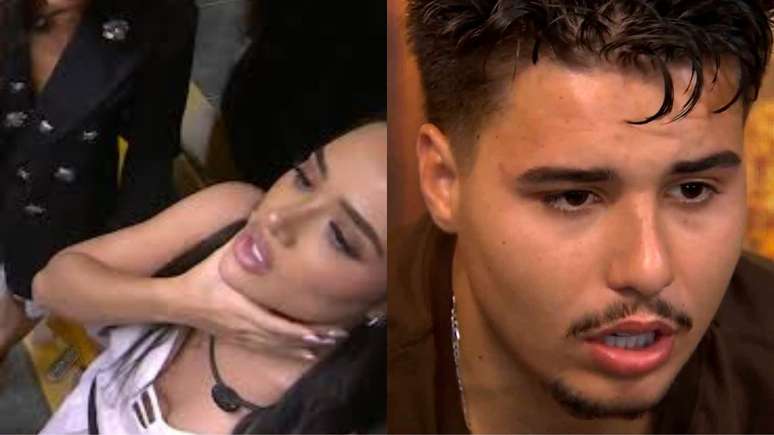 "Tem uma parede, aí ele pegou e me prensou assim na parede, fez assim", contou a morena, que deixou os brothers surpresos ao mostrar como foi a cena. "Ele não apertou, mas ele segurou, eu senti a mão dele no meu pescoço", acrescentou ela.