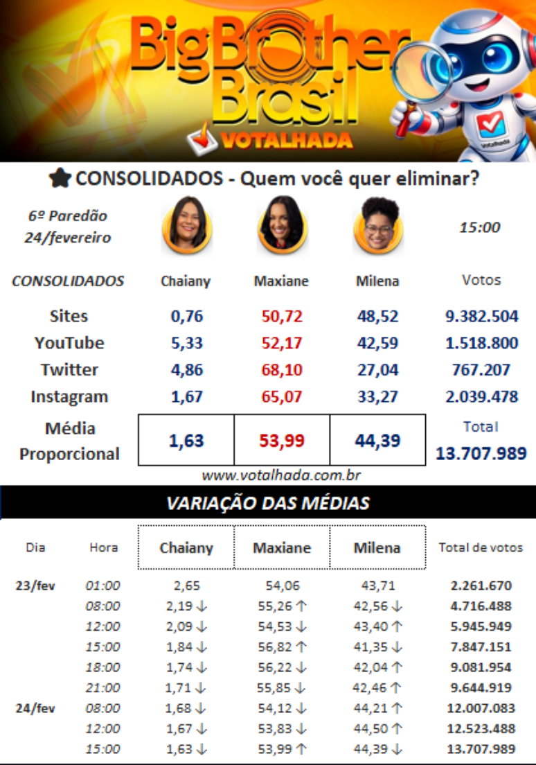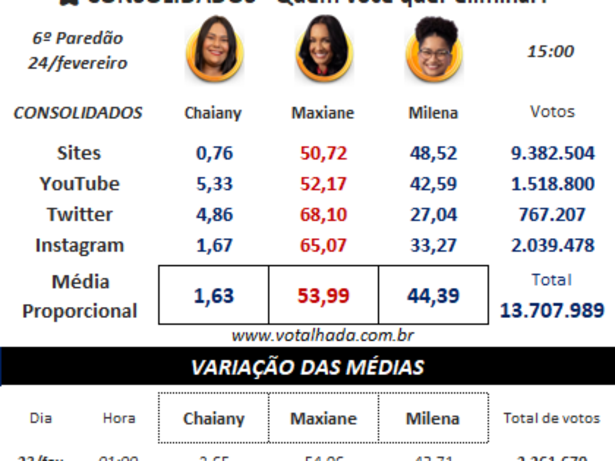 A disputa do sexto paredão do Big Brother Brasil 26 movimenta torcidas e redes sociais. Milena, Chaiany e Maxiane estão na berlinda, mas os números mais recentes da enquete parcial do Votalhada indicam cenários bem distintos entre elas. Enquanto duas participantes aparecem tecnicamente empatadas em rejeição, a terceira segue com ampla vantagem para continuar na casa mais vigiada do país.