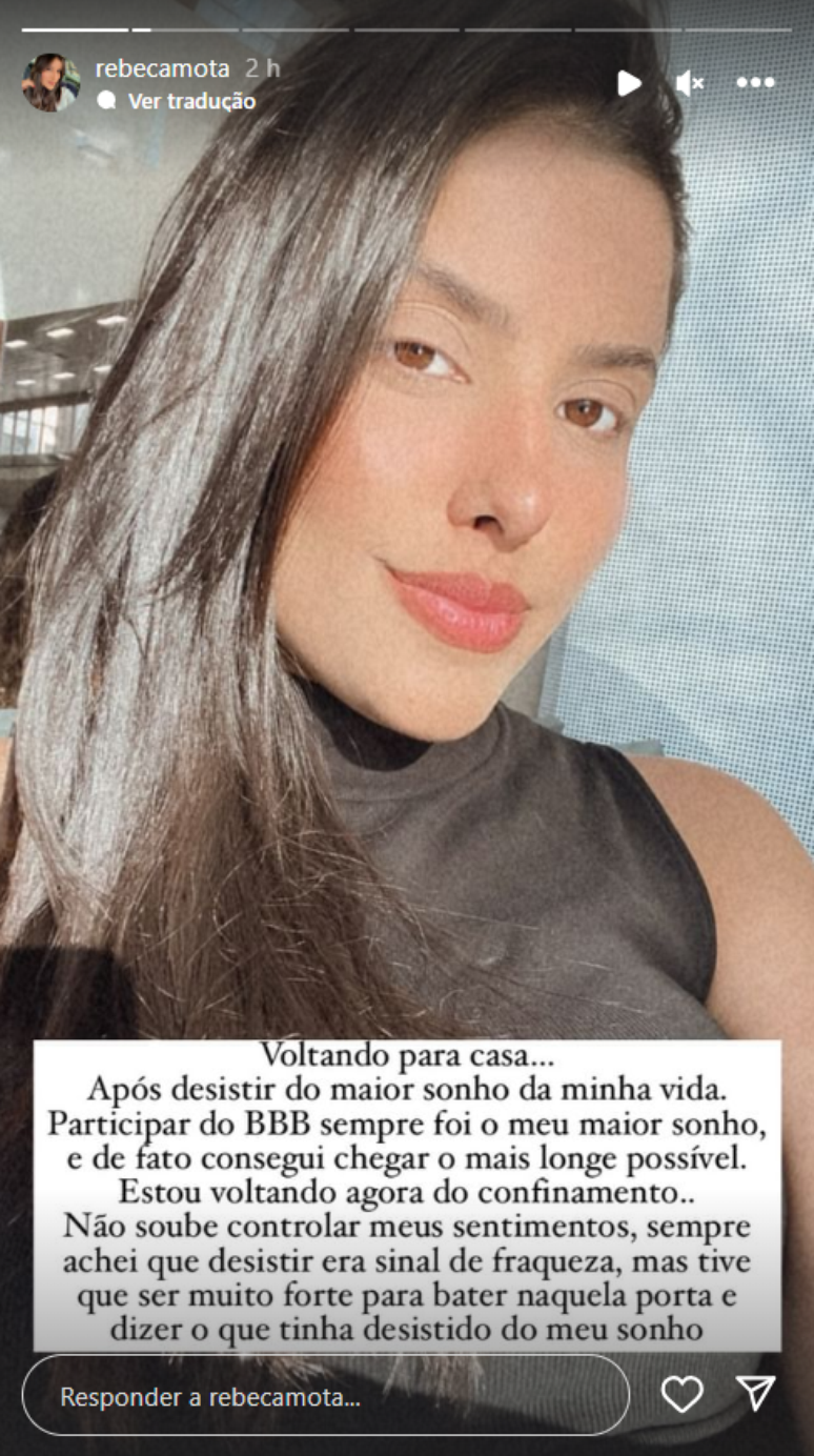 "Voltando para casa… Após desistir do maior sonho da minha vida.", Rebeca publicou nos stories. "Participar do BBB sempre foi o meu maior sonho, e, de fato, consegui chegar o mais longe possível. Estou voltando agora do confinamento. Não soube controlar meus sentimentos, sempre achei que desistir era sinal de fraqueza, mas tive que ser muito forte para bater naquela porta e dizer que tinha desistido do meu sonho", continuou.