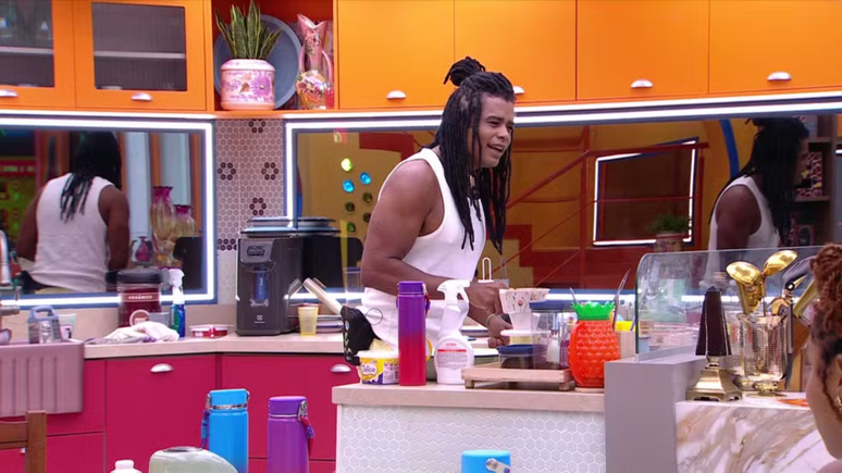Thamiris, que também estava na cozinha com eles, brincou que iria se esconder atrás do biscoito que estava comendo. "Não fui, não [que tomou iniciativa para o beijo]", disse ela.