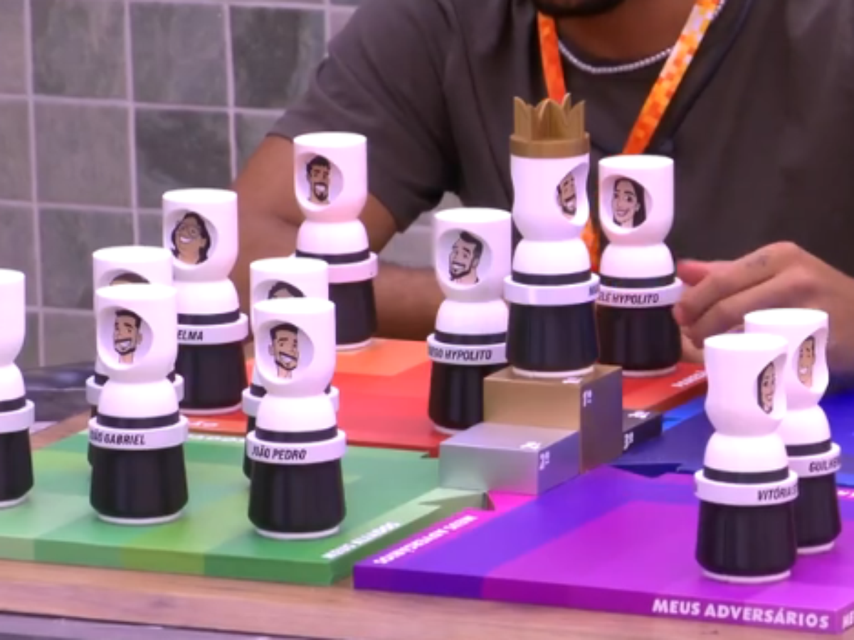 “Os cinco votos nela. Porque, aí, iria esses dois", diz o nadador, segurando os bonecos de Delma e Vinícius no tabuleiro do Apê do Líder.