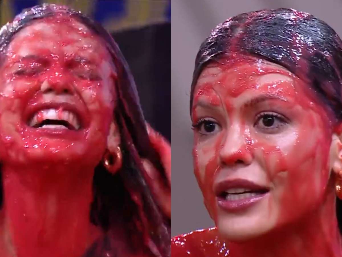 Vitória Strada não conseguiu segurar a risada ao ser 'tombada' por João Pedro durante o Sincerão desta segunda-feira (7) no BBB 25. Ao tomar banho de gosma vermelha no confinamento, ela precisou se recompor e tomou uma bronca de Tadeu Schmidt antes de rebater o rival.