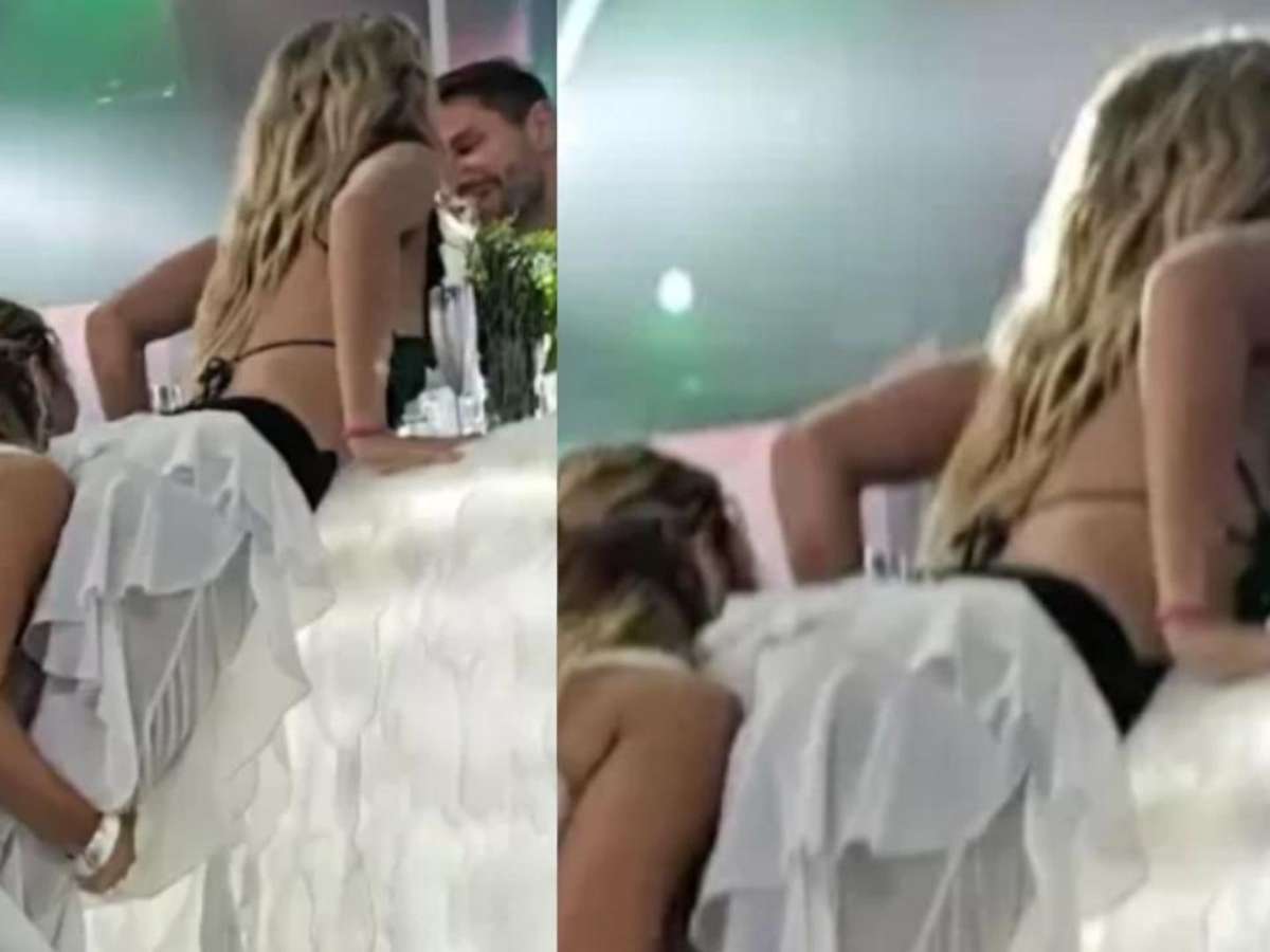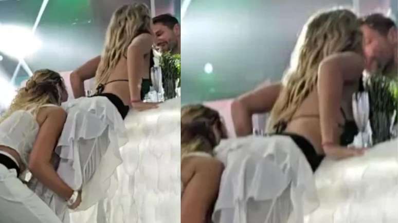 Embalados por música e dança, os dois brothers foram fotografados por Milena dando o selinho. O momento contou com a ajuda de Sarah Andrade, que levantou a gaúcha para que ela alcançasse o modelo, que estava no bar da festa.