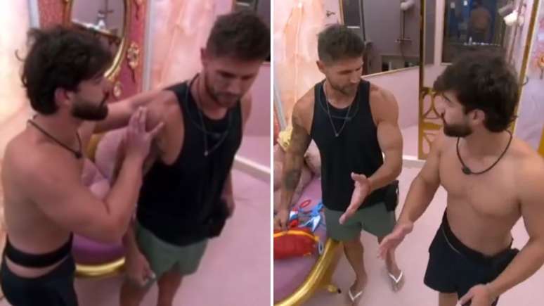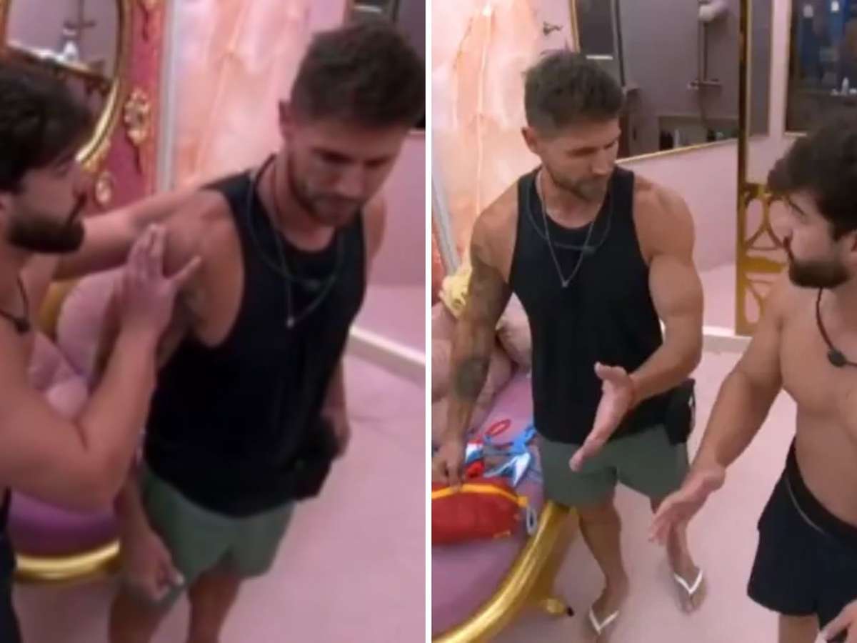 "Você viu o que você fez, né? Você acha que fez certo?", disse o loiro no banheiro ao encontrar o brother. "Você tava meio dormindo ainda, você caiu molenga. Você acha que eu te empurrei?", perguntou P.A. E o veterano respondeu: "Mano, eu não caí sozinho".