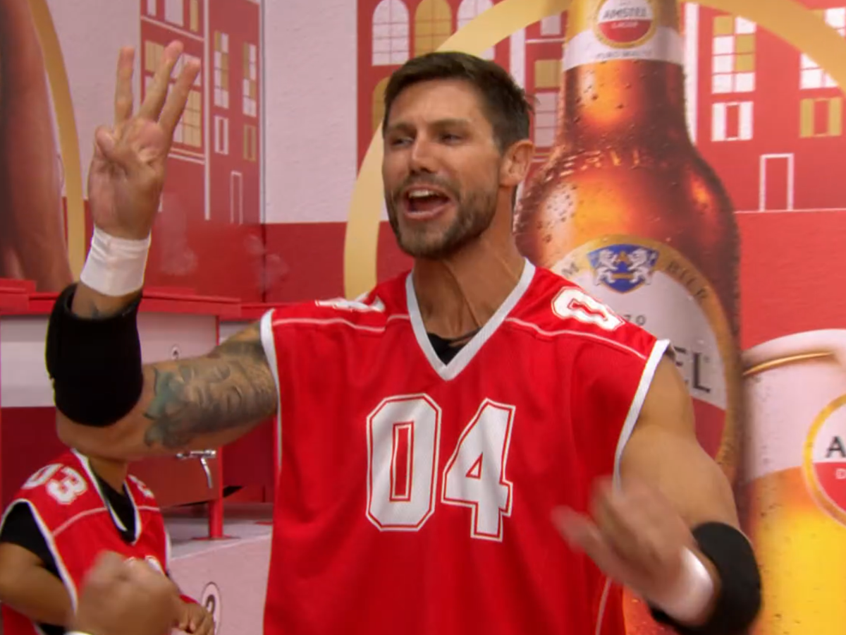 A primeira etapa da prova do líder foi disputada em duplas. O primeiro participante da dupla precisava encher uma bolsa com um líquido e atravessar uma rampa cheia de espuma. Ele encontrava o parceiro do outro lado e transferia o líquido da bolsa para a dupla, que atravessava uma piscina de bolinhas com a bolsa para encher um tanque. No tanque, havia uma bolinha. Quem conseguisse pegar a bolinha em menor tempo ganhava.