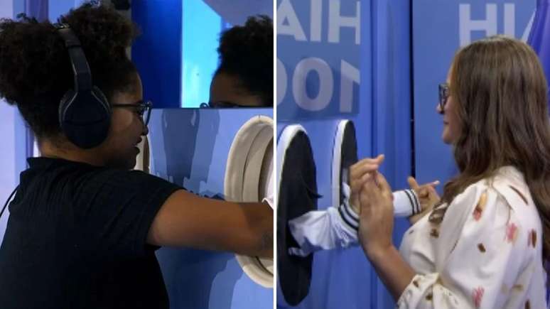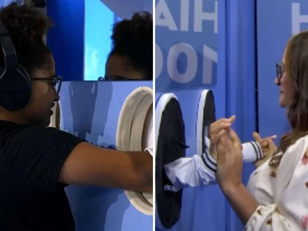 O momento aconteceu na área externa da casa. Com um fone de ouvido, Milena se aproximou de uma parede e colocou as mãos em um buraco, conseguindo tocar a mãe fisicamente. A surpresa foi imediata. "Oi, mãe! Me dá as mãos, minha filha. Cadê os anéis? Tu tá no Rio, mulher", disse ela, visivelmente emocionada.