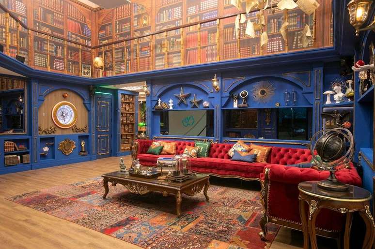 Na sala do BBB 24 encontramos três cores bem marcantes no ambiente: azul cobalto, vermelho e marrom.