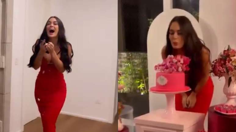 "Estou muito feliz demais. Achei que não ia fazer nada de aniversário, mas o povo fez uma festa surpresa pra mim. Coisa mais linda, cheia de coisas que eu gosto", comemorou a morena.