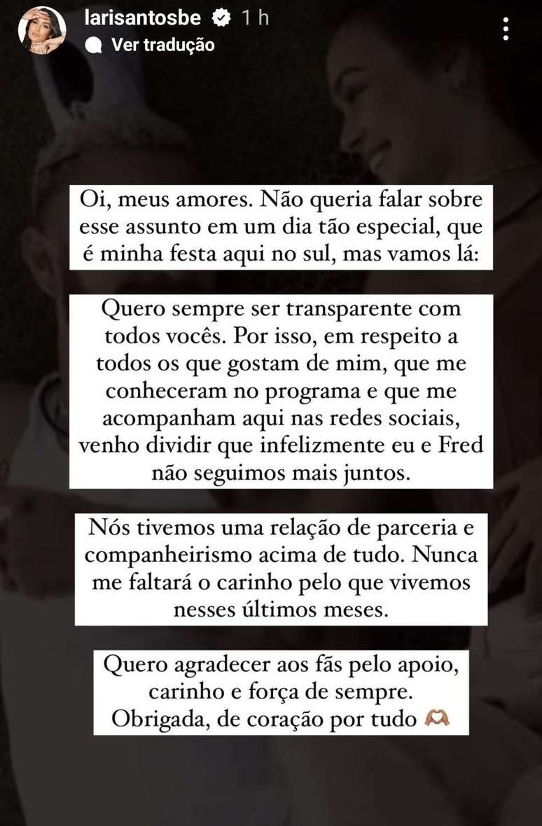 Nesta tarde, a professora disse que "não queria falar sobre esse assunto em um dia tão especial", em referência à sua festa de aniversário feita em Santa Catarina. "Quero sempre ser transparente com todos vocês. Por isso, em respeito a todos os que gostam de mim, que me conheceram no programa e que me acompanham aqui nas redes sociais, venho dividir que infelizmente eu e Fred não seguimos mais juntos", escreveu Larissa.