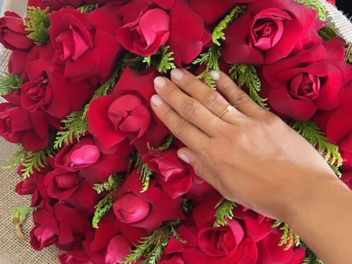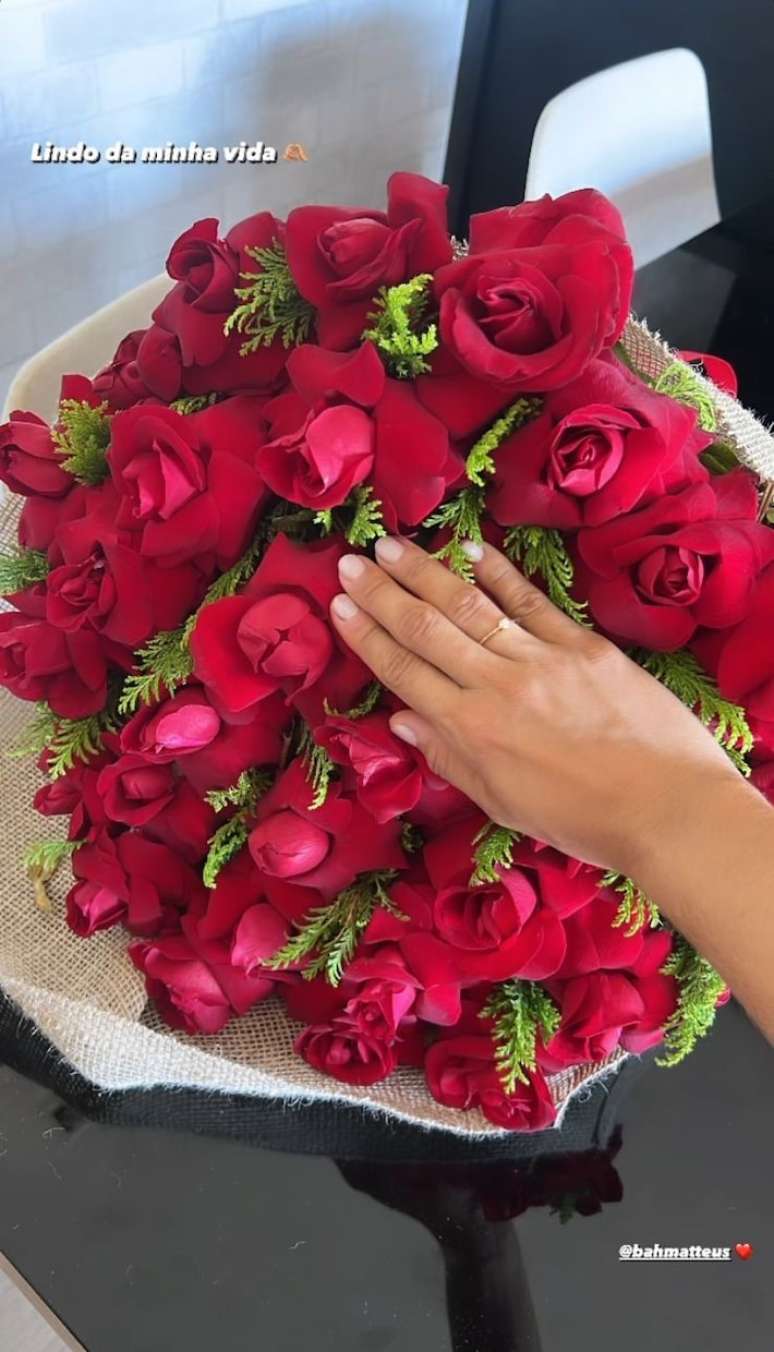 "Ontem eu recebi uma visita, uma surpresa linda, vou compartilhar com vocês", disse a ex-BBB em um vídeo publicado nos stories de seu Instagram. Em seguida, mostrou que recebeu flores e um anel de Matteus. "Lindo da minha vida", escreveu a manauara. Veja a foto: