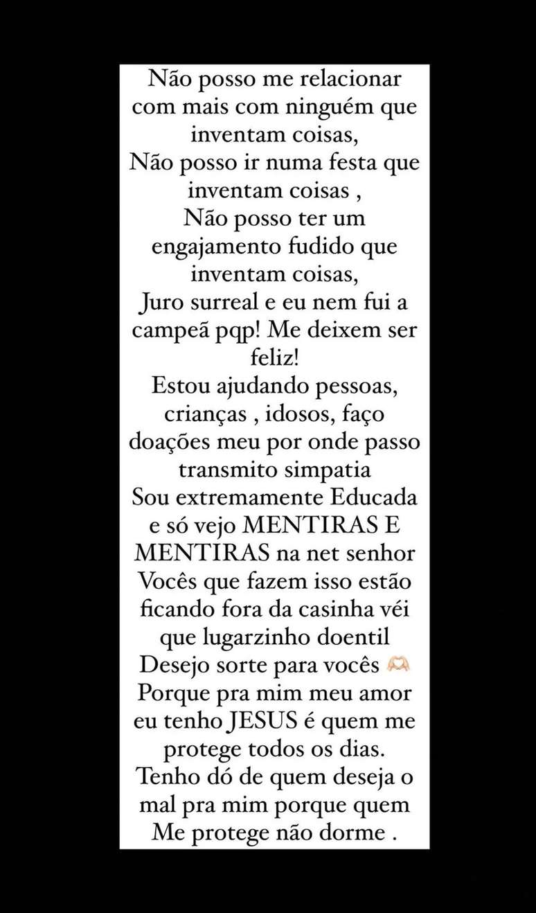 "Sou extremamente educada e só vejo mentiras e mentiras na net. Vocês que fazem isso estão ficando fora da casinha. Que lugarzinho doentio. Tenho dó de quem deseja mal para mim porque quem me protege não dorme."