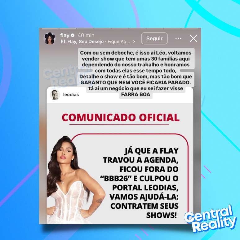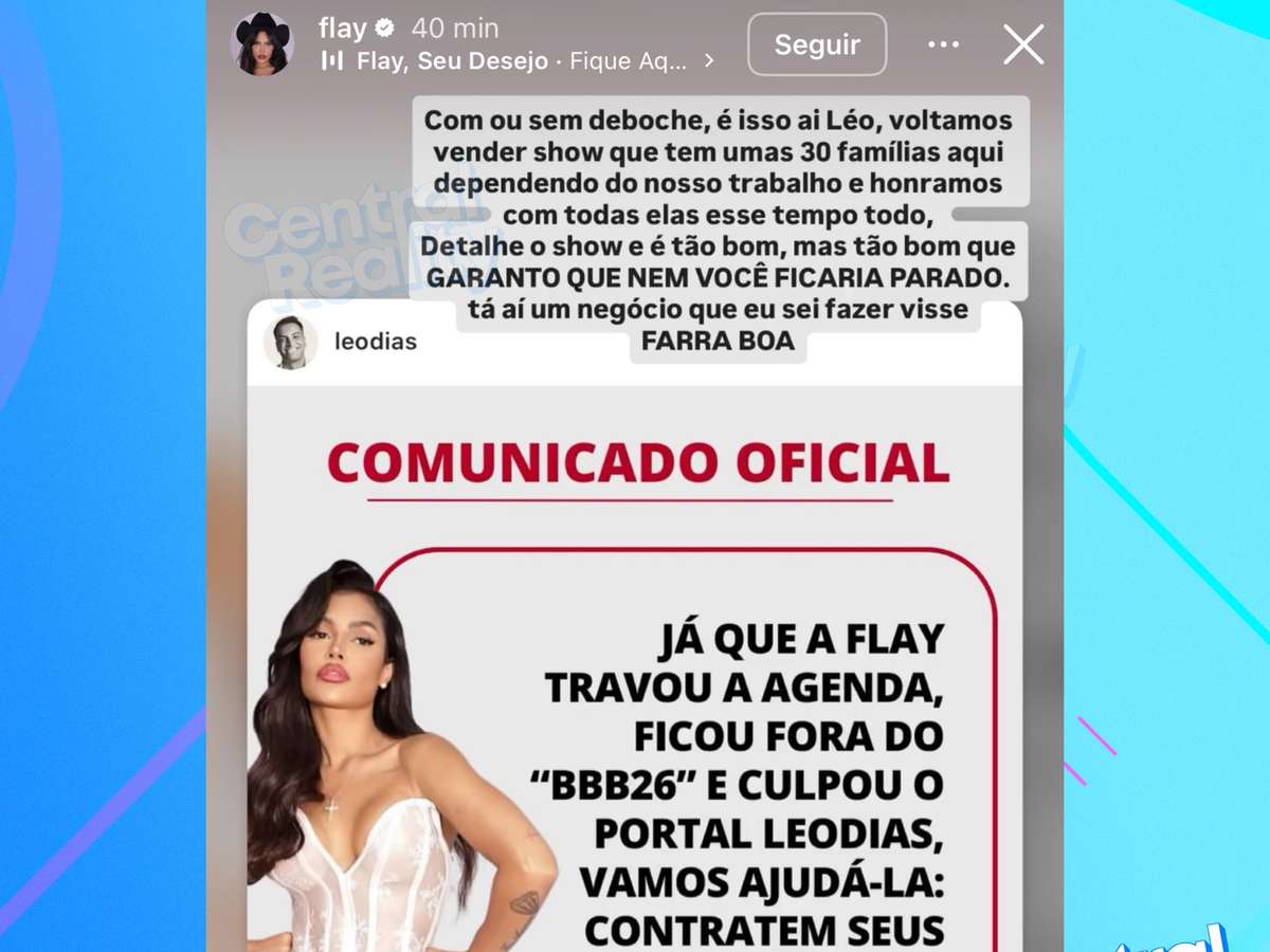 A madrugada desta quinta-feira (8) foi marcada por um novo embate público entre a cantora e ex-BBB Flay e o jornalista Leo Dias, depois que a artista afirmou ter perdido a chance de participar do BBB 26 por causa de um vazamento de informações. Segundo ela, as negociações estavam em andamento e, por esse motivo, sua agenda de shows chegou a ser pausada no fim de dezembro, na expectativa de entrar no confinamento como veterana da atração.