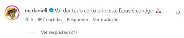 "Vai dar tudo certo, princesa. Deus é contigo", escreveu o funkeiro.