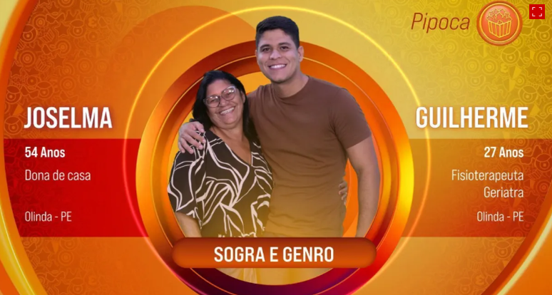 Guilherme e Joselma, genro e sogra, foram escolhidos por votação popular para entrar no reality show. Vindos de Olinda, Pernambuco, os dois prometem movimentar a casa com suas personalidades distintas e enérgicas.