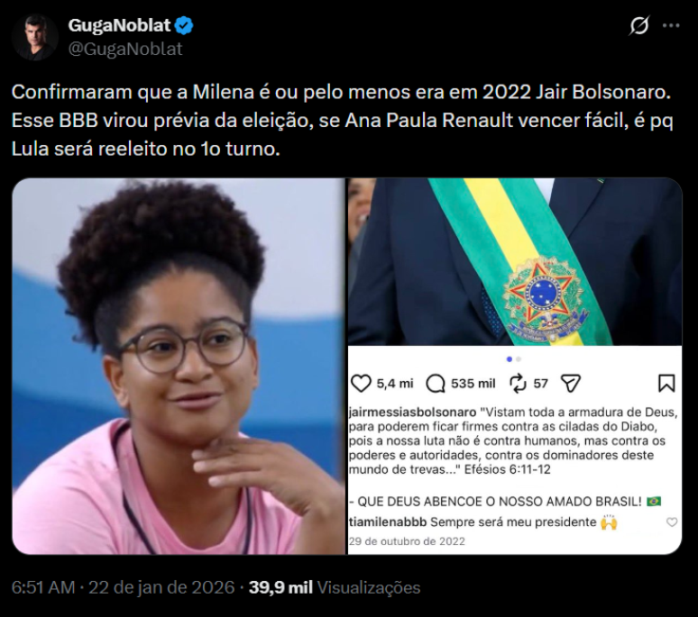 O assunto ganhou ainda mais alcance depois que Guga Noblat publicou, em seu perfil no X, o print com o comentário de Milena.