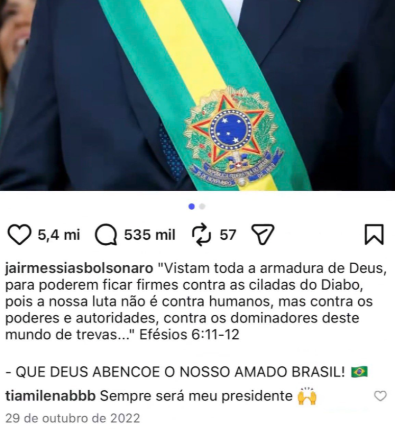 Na interação, feita em 2022, a sister escreveu: "Sempre será meu presidente". O print crculou nas redes nos últimos dias e colocou o nome de Milena no centro de uma nova polêmica fora da casa.