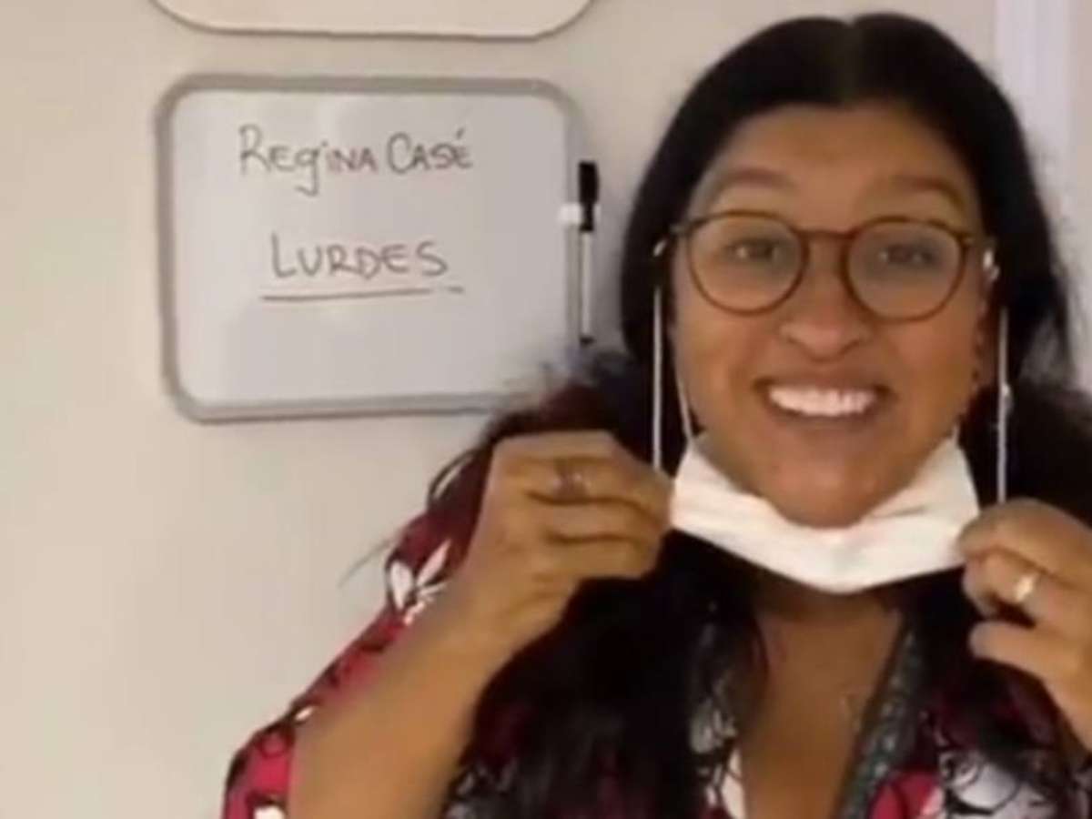 A atriz Regina Casé usou seu Instagram para comemorar a volta às gravações da novela Amor de Mãe, interrompidas em março por conta da pandemia do novo coronavírus, como a personagem Lurdes, na última sexta-feira, 14.