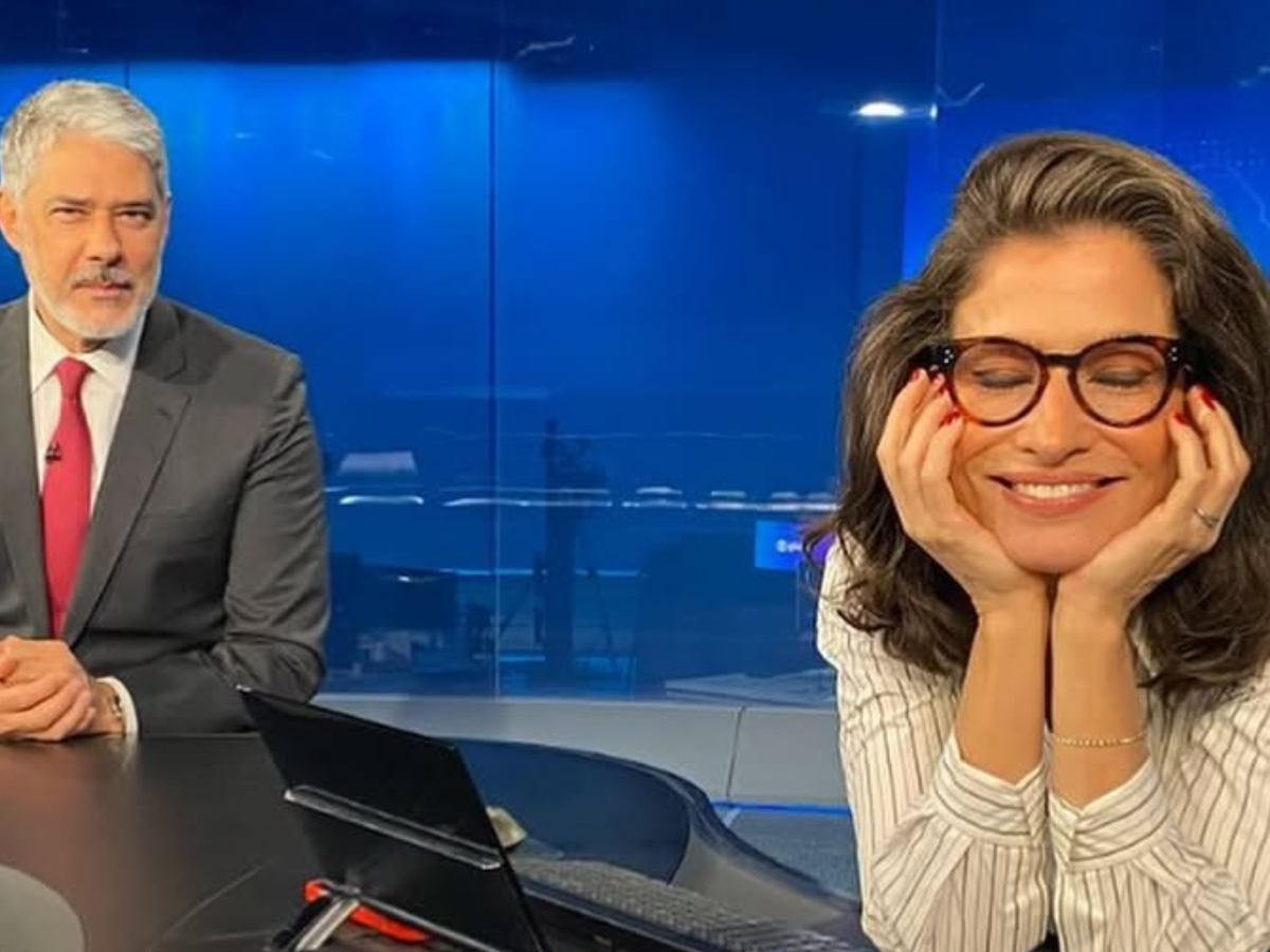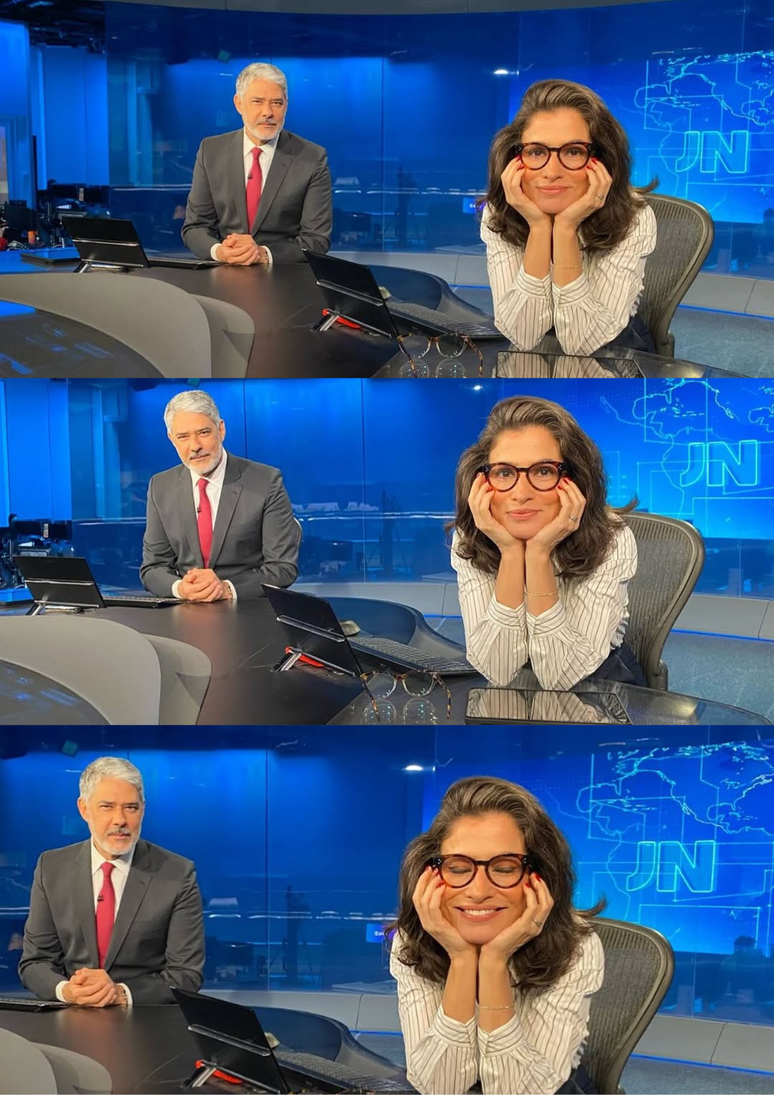 No carrossel com três fotos, Renata surge com a cabeça apoiada nas mãos, variando entre sorrisos. Bonner aparece “posturado” ao lado da colega. Veja: