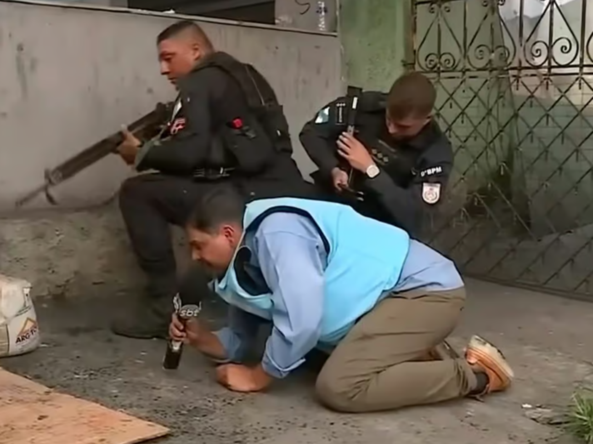 Repórter do SBT se protege atrás de policiais durante tiroteio no Rio