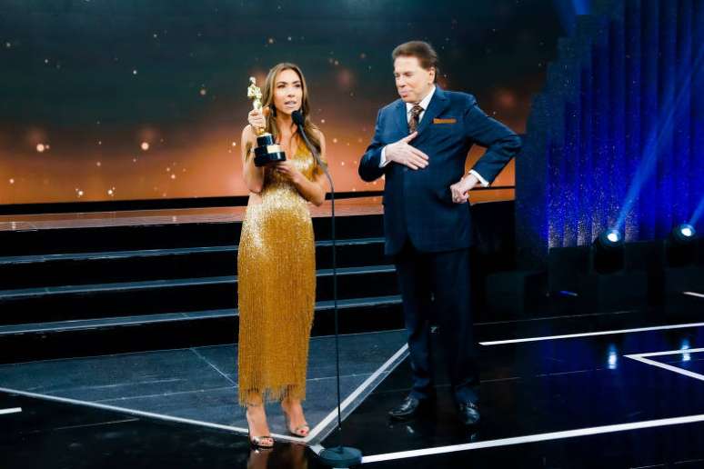 Agora, a estatueta homenageia o veterano da TV em dois formatos. Um deles é a imagem de Silvio Santos, transformada no busto dourado. E a outra é o microfone icônico usado por ele e parte de seu terno.