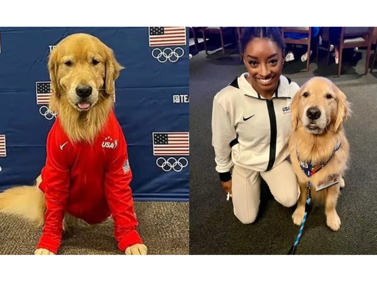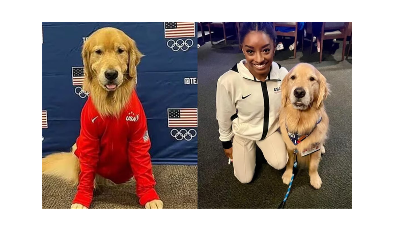 Lideradas por Simone Biles, as meninas da equipe norte-americana contam com um trunfo fofíssimo chamado Beacon -um cão da raça golden retriever.