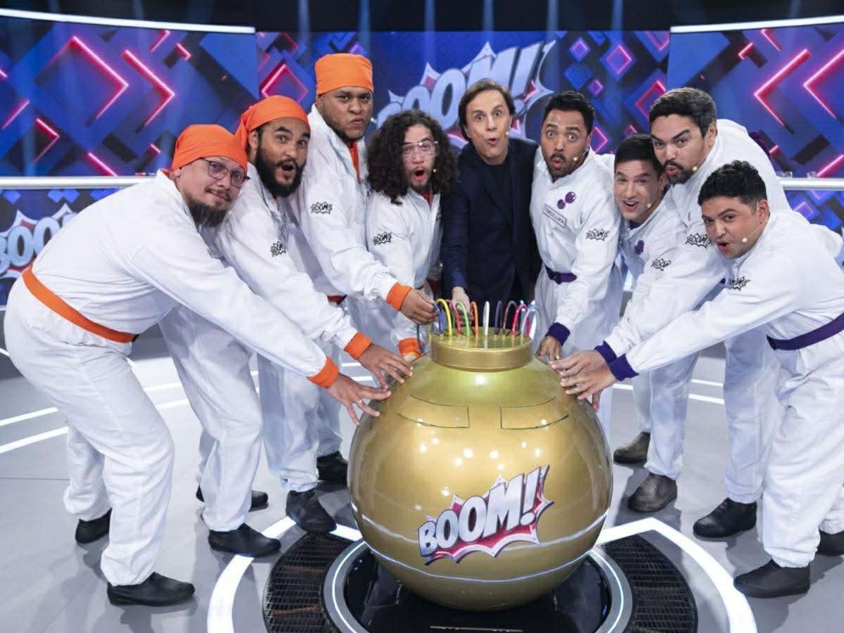 Bombas cenográficas com diversos fios coloridos ocupam o centro da disputa. Nele, cada fio corresponde a uma opção de resposta, e o objetivo dos competidores é direto: romper somente os fios ligados às alternativas incorretas, preservando o fio da resposta certa. Qualquer erro pode detonar o artefato, resultando na perda do prêmio. Segundo Tom, o diferencial do programa reside justamente nessa inversão de lógica: "É um formato vibrante, que deixa os jogadores muito nervosos na hora das perguntas. No Boom! é preciso ter muita atenção, porque não pode cortar as respostas certas, só as erradas. O programa tem esse diferencial, bem mais minucioso nesse sentido."