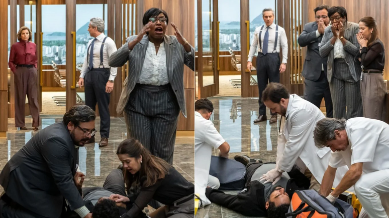 Pouco tempo depois, Mário Sérgio sente mal-estar e tenta disfarçar na frente dos colegas. Marieta (Cacá Ottoni), Consuêlo (Belize Pombal) e Freitas (Luis Lobianco) tentam ajudá-lo, mas ele desmaia na antessala da TCA. Paramédicos são acionados rapidamente, e a movimentação chama a atenção de Odete e Marco Aurélio, que saem de suas salas para verificar o que ocorreu.