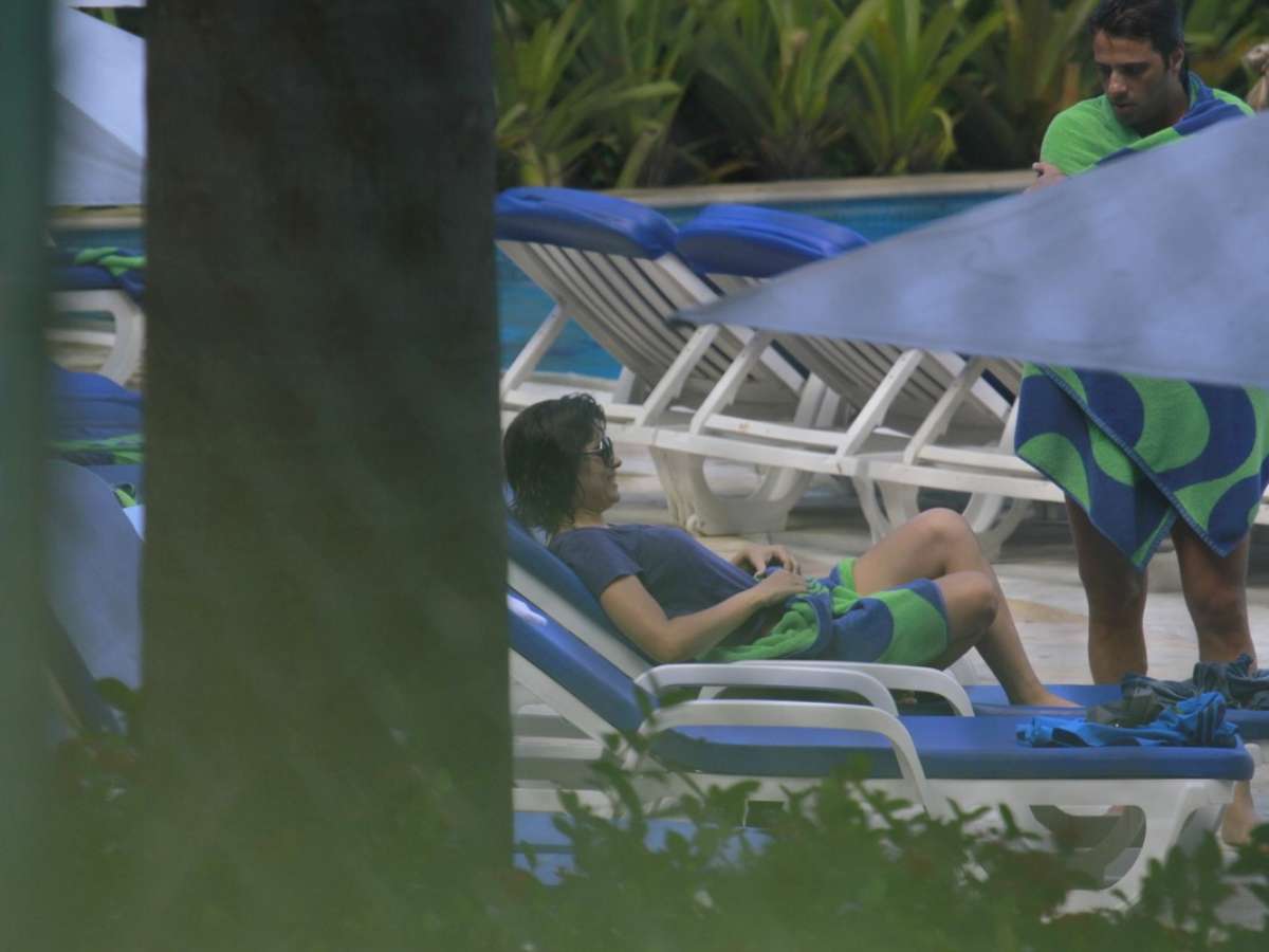 Se na última ocasião os dois trocaram muitos carinhos e beijos dentro da água, desta vez Giácomo manteve uma maior distância do amado - pelo menos na única foto dos dois na piscina. Ao saírem da água, Dioguardi se enrolou em uma toalha, aparentemente com frio, enquanto Giácomo vestiu uma camiseta azul marinho.