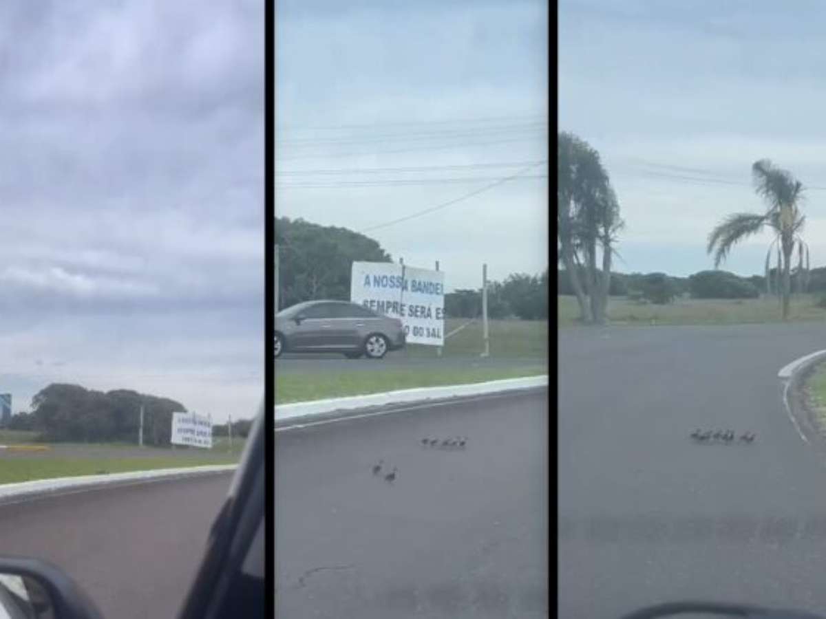 Cena curiosa no Litoral Norte gaúcho atrai atenção com travessia inusitada de aves na via. Homem auxilia travessia. Veja o vídeo: