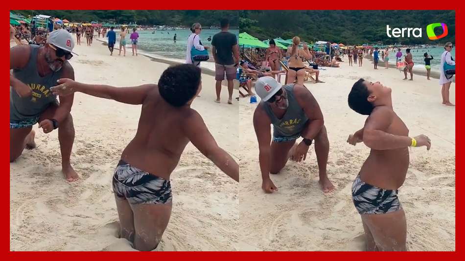 Menino viraliza ao imitar 'bonecão de posto' em praia do RJ
