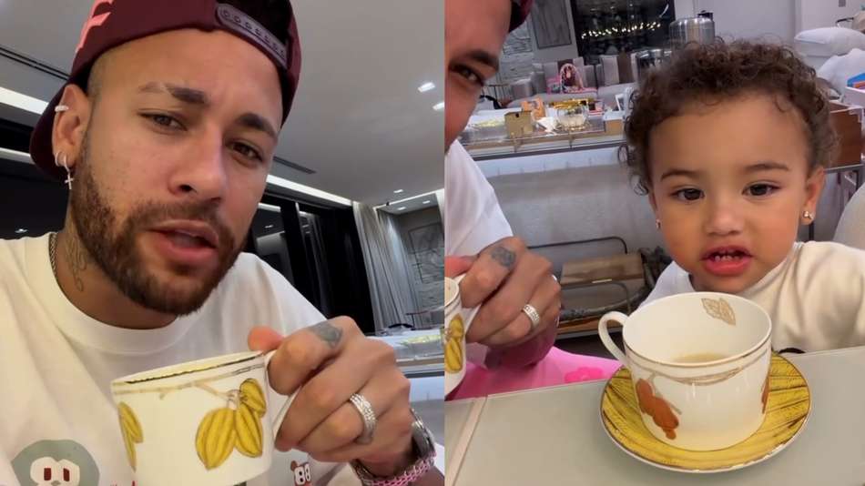 O jogador publicou nesta terça-feira, 14, o registro do momento especial com a filha. "Tomando um cafézinho com a minha dupla", brinca Neymar. Em seguida, a pequena decide tomar o café de um jeito diferente e coloca a mão dentro da xícara. Nos Story seguinte, ele publicou uma imagem de Bruna Biancardi, Mavie e Mel, sua caçula. Reprodução/@neymarjr/Instagram