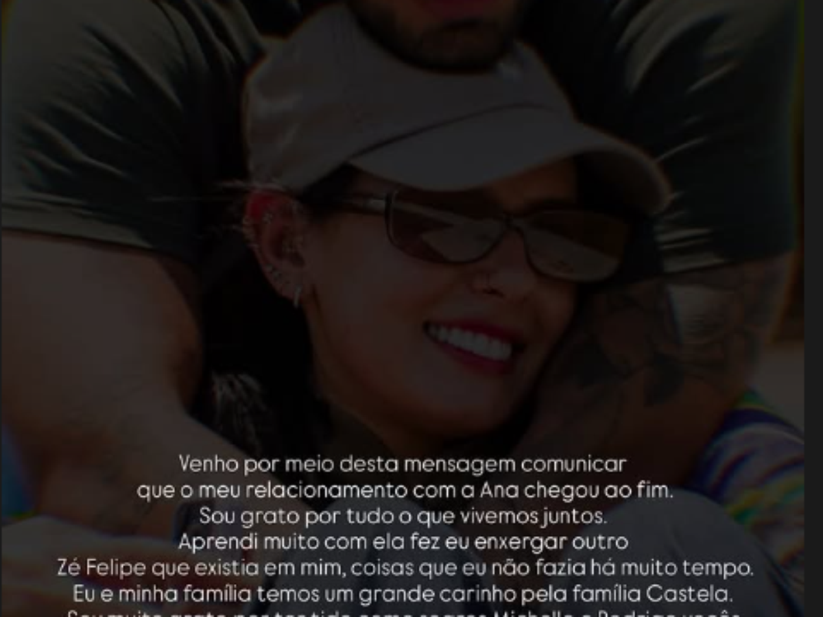 "Venho por meio desta mensagem comunicar que o meu relacionamento com a Ana chegou ao fim. Sou grato por tudo o que vivemos juntos. Aprendi muito com ela, fez eu enxergar outro Zé Felipe que existia em mim", diz um trecho do comunicado.