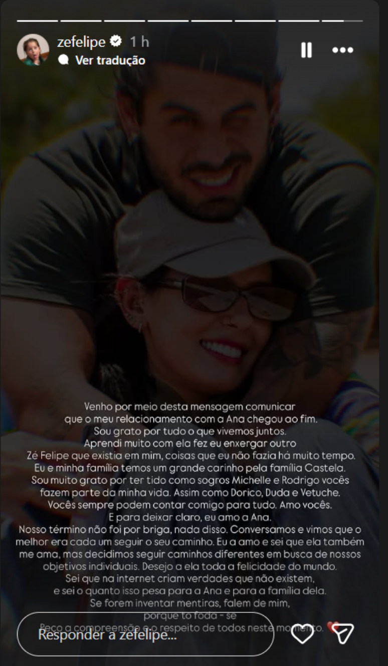 O texto foi publicado inicialmente por Zé Felipe e, na sequência, repostado por Ana Castela em seus próprios stories, indicando uma comunicação alinhada entre os dois.