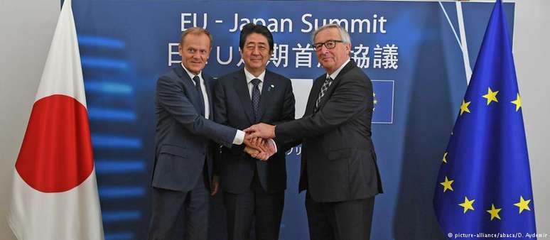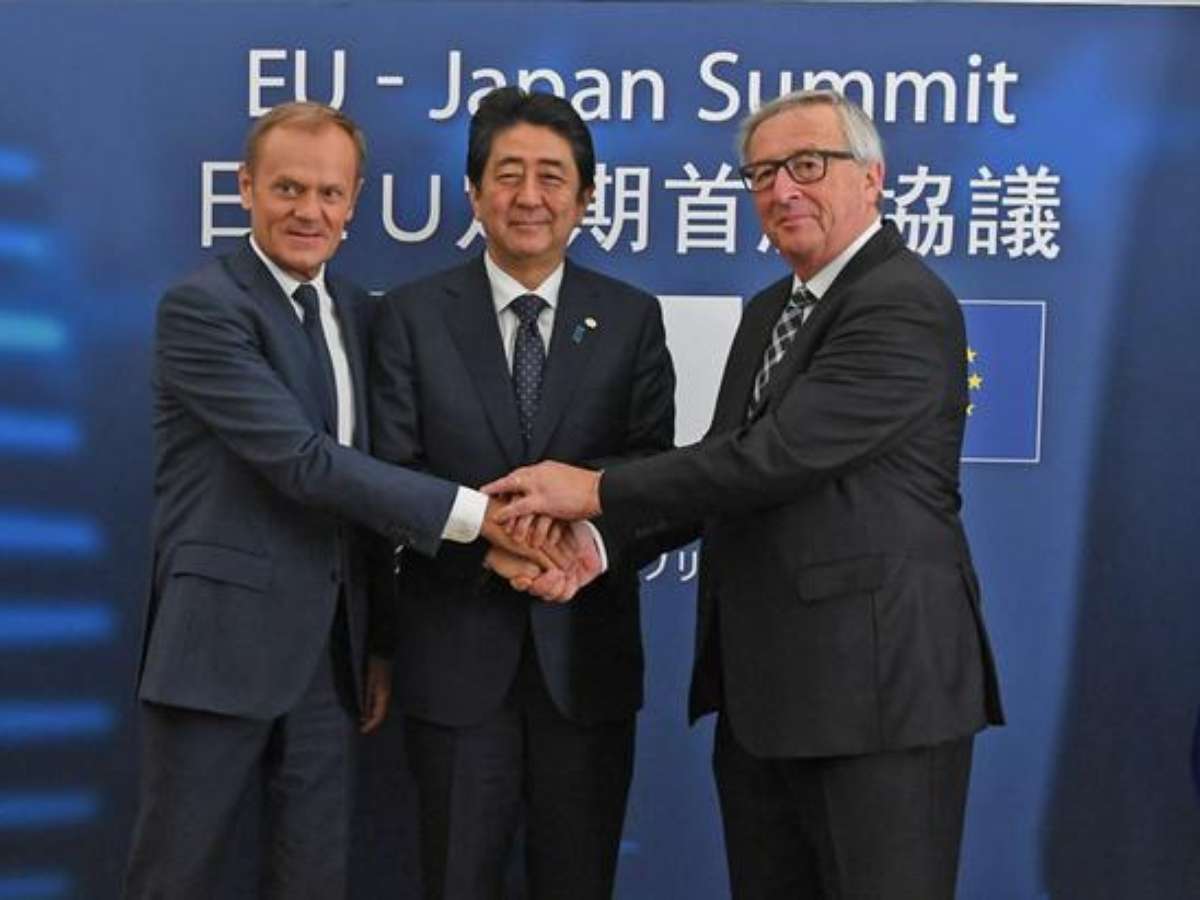 O primeiro-ministro japonês, Shinzo Abe, se reuniu com o presidente da Comissão Europeia, Jean-Claude Juncker, e o presidente do Conselho Europeu, Donald Tusk, em Tóquio para assinar o documento, durante a 25ª cúpula UE-Japão.