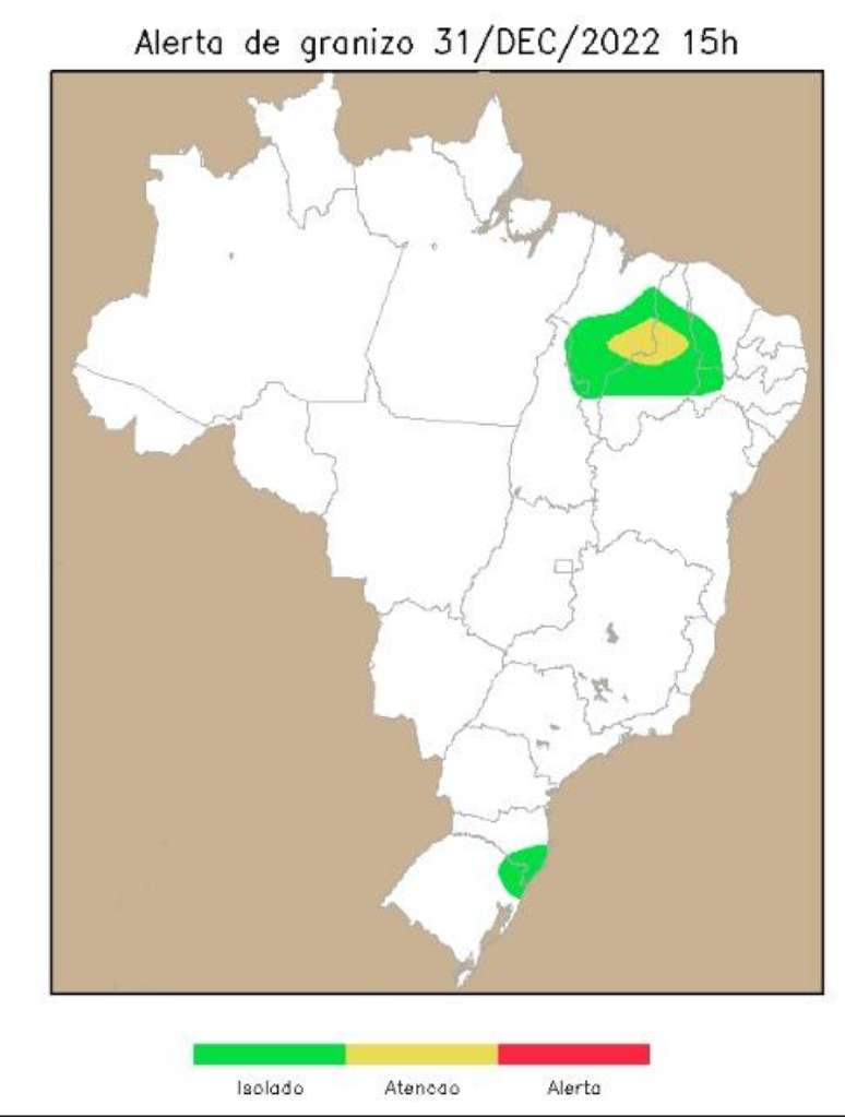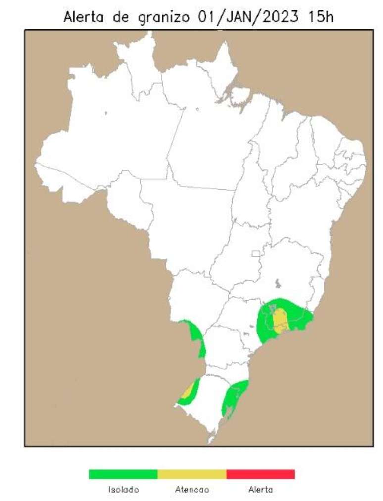 No decorrer do dia 01 de janeiro de 2023, há um risco maior de granizo no oeste do Rio Grande do Sul, no oeste e sudoeste do Paraná, assim como no sul do Mato Grosso do Sul, em São Paulo, Rio de Janeiro e Minas Gerais.