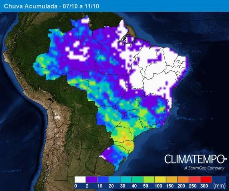 No final do domingo (09/10), chove forte com temporais, ventania e descargas elétricas atmosféricas entre a Região Sul e o Sudeste do Brasil. Novamente, há risco para queda de granizo que pode afetar áreas produtoras entre São Paulo e Sul de Minas Gerais, mas a chuva por outro lado irá beneficiar a semeadura da soja. Os maiores acumulados de chuva serão observados entre Santa Catarina e Paraná. Em algumas localidades destes estados pode passar dos 100 milímetros.