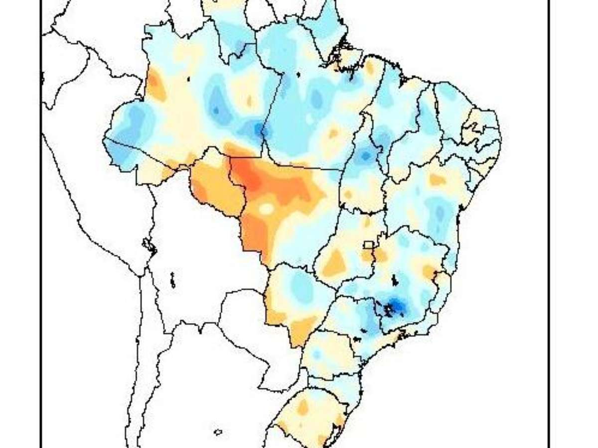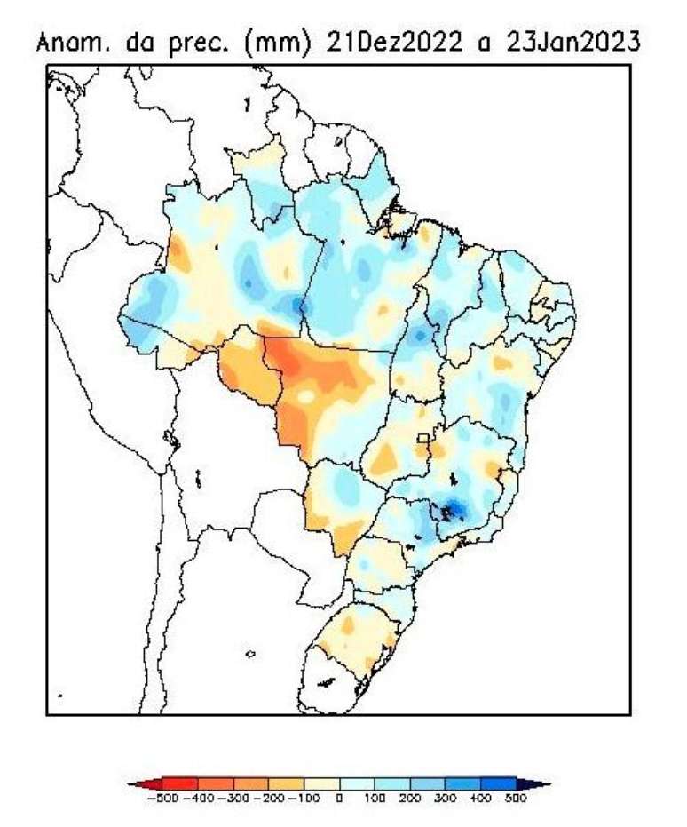 Desvios positivos (azul) e negativos (laranjas) de chuva ao longo do mês primeiro mês de verão.