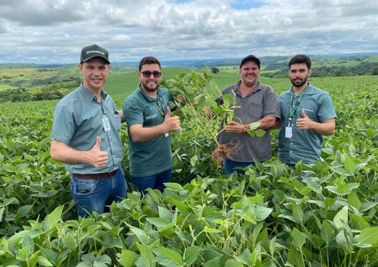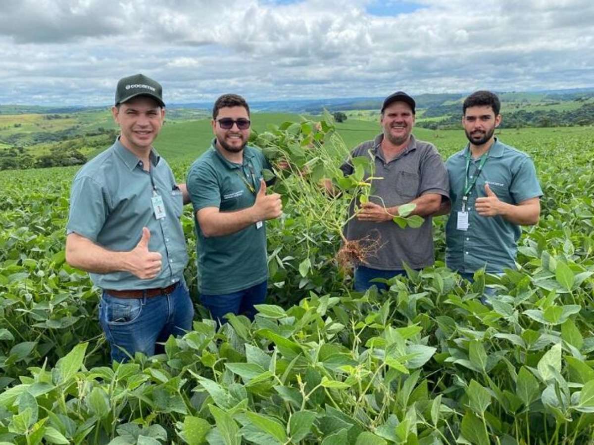 da esquerda para direita: Rafael Furlanetto, gerente técnico da Cocamar; Eduardo Pires, engenheiro agrônomo da unidade da cooperativa em Tamarana; o produtor José Roberto Simões e o engenheiro agrônomo trainee, Luiz Fernando