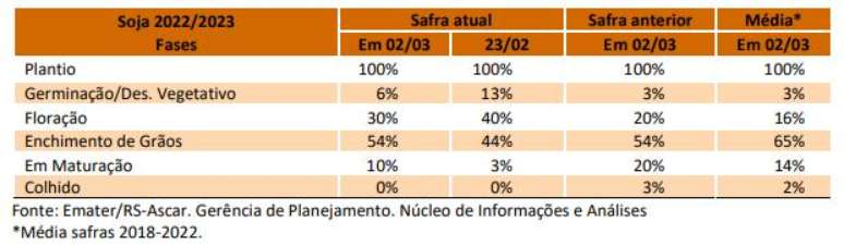 A área projetada para a safra 2022/2023 de soja no Rio Grande do Sul é de 6.568.607 hectares. A produtividade estimada inicialmente é de 3.131 kg/ha. A cultura apresenta predomínio de lavouras em fases reprodutivas, com 30% em floração e 54% em enchimento de grãos.