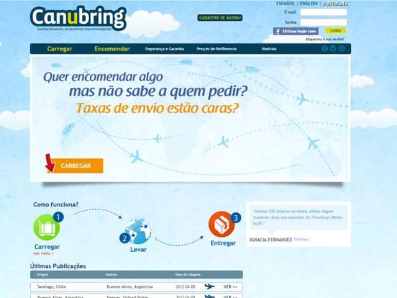 Vai viajar e quer um "extra" para ajudar a pagar a viagem? Ou quer comprar um produto que é vendido no exterior com um preço muito mais atrativo, mas não tem nenhuma viagem programada? Com o slogan de "ganhe levando, economize encomendando", a rede social "Canubring" (Você pode trazer) promete ajudar os dois lados a lucrarem usando vazio na mala. Segundo o site, a economia chega a até 70% para quem compra já que além de pagar um preço mais baixo pelo produto no exterior a pessoa também desembolsa um valor menor pelo transporte.