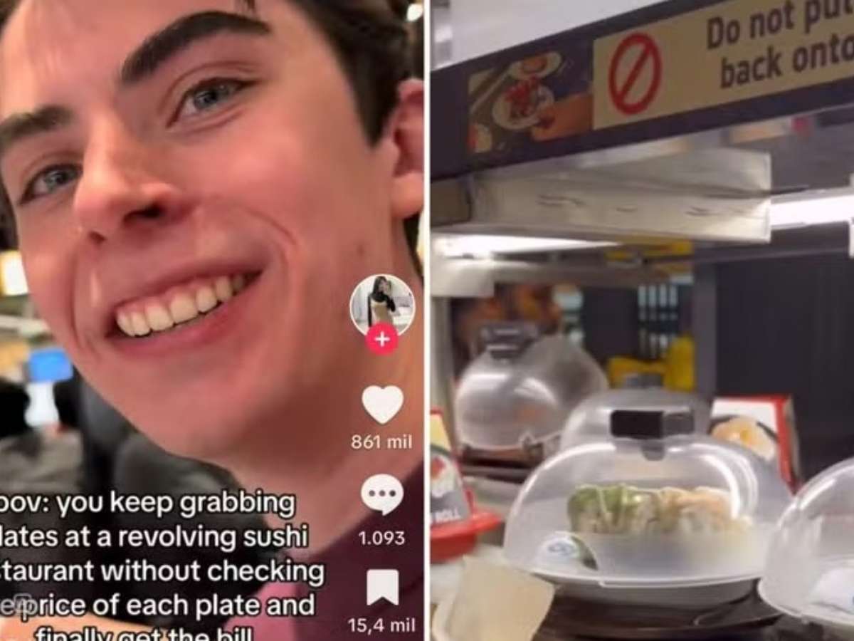 “Gente, pensei que fosse dar uns US$ 70”. Na imagem do vídeo, a tiktoker escreveu: “POV: Você pega itens em um restaurante de sushi de esteira sem verificar o preço de cada prato e finalmente recebe a conta”, disse um dos amigos.