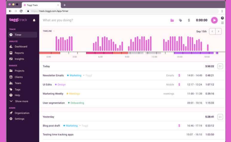 Trata-se do Toggl, que não se limita a apenas acompanhar o andamento de cada projeto. Com ele, é possível centralizar todas as tarefas mais importantes da empresa numa única página. Ele permite ver na mesma timeline todos os times e as tarefas de dependem de uma ou mais equipes.