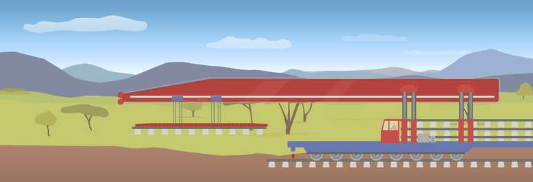 Depois de assentar cada seção, o veículo de 92 metros - com a ajuda de suas 64 rodas - volta para pegar outro bloco. Em seguida, ele rola para frente sobre a parte que acabou de assentar para inserir outra seção.