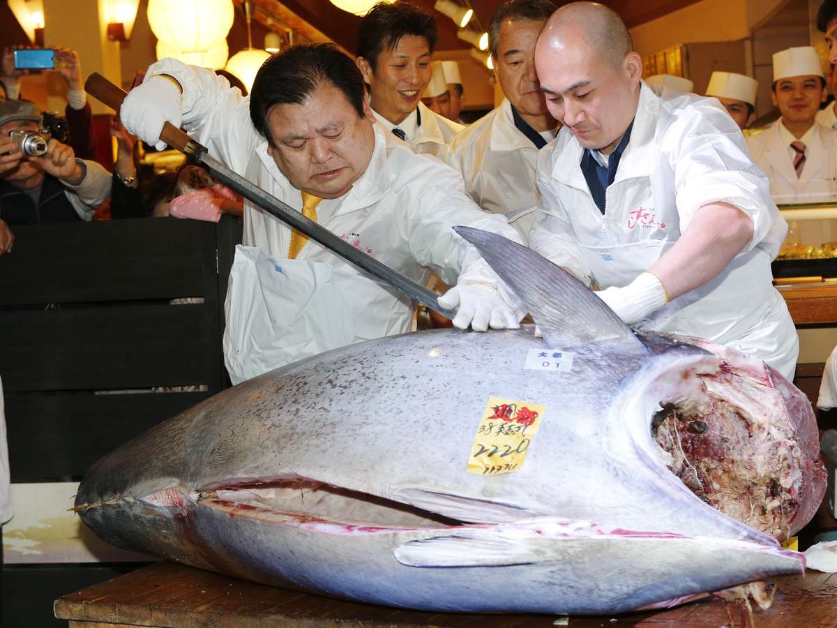 Kiyoshi Kimura, proprietário de uma famosa rede de restaurantes de sushi, corta atum de 222 kg após ganhar leilão no mercado de peixes Tsukiji, em Tóquio. Kimura pagou US$ 1,8 milhão no primeiro leilão do ano do grande mercado