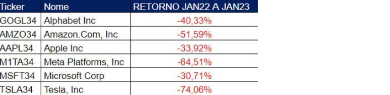 Com isso, o investidor brasileiro que tivesse aportado em uma carteira com BDRs de todas essas companhias teria perdido metade do valor investido entre janeiro de 2022 e janeiro de 2023, de acordo com levantamento feito pela Economatica a pedido do Terra.