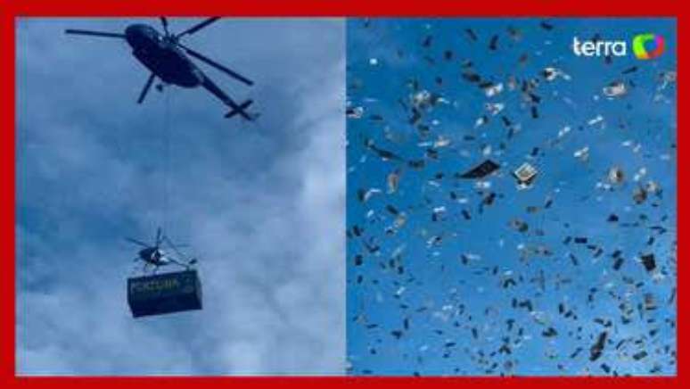 Imagens do dinheiro literalmente 'caindo do céu' começaram a circular nas redes na terça-feira, 24. No vídeo é possível ver as cédulas voando e pessoas correndo em direção ao local em que o helicóptero passava. (Confira abaixo)